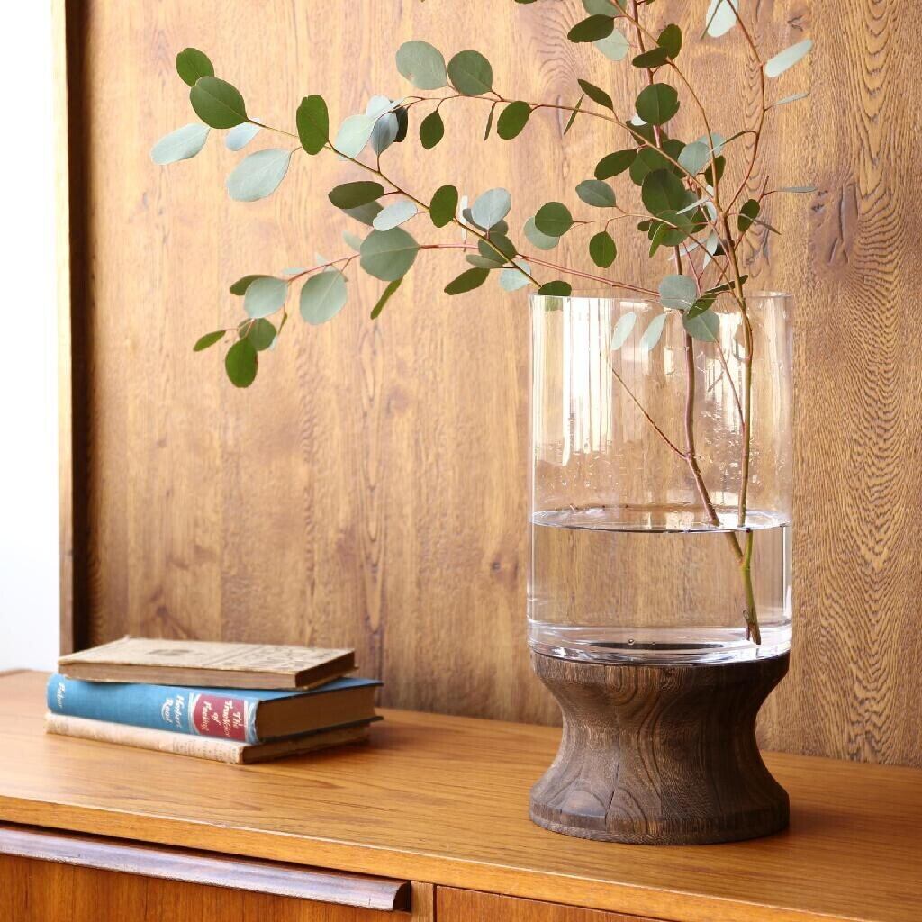 木の持つ温かみとガラスの透明感が相まって、一際存在感を放つフラワーベース。