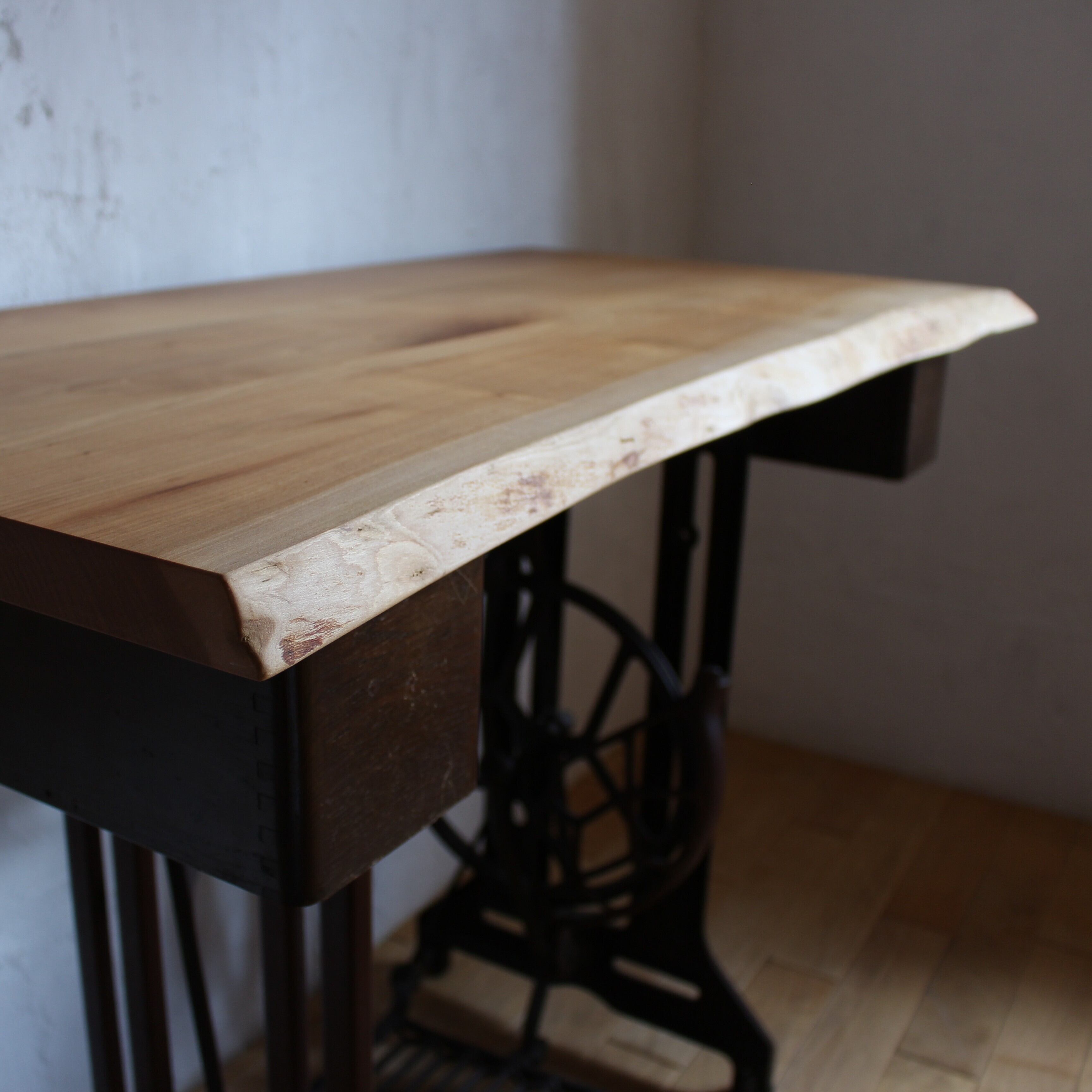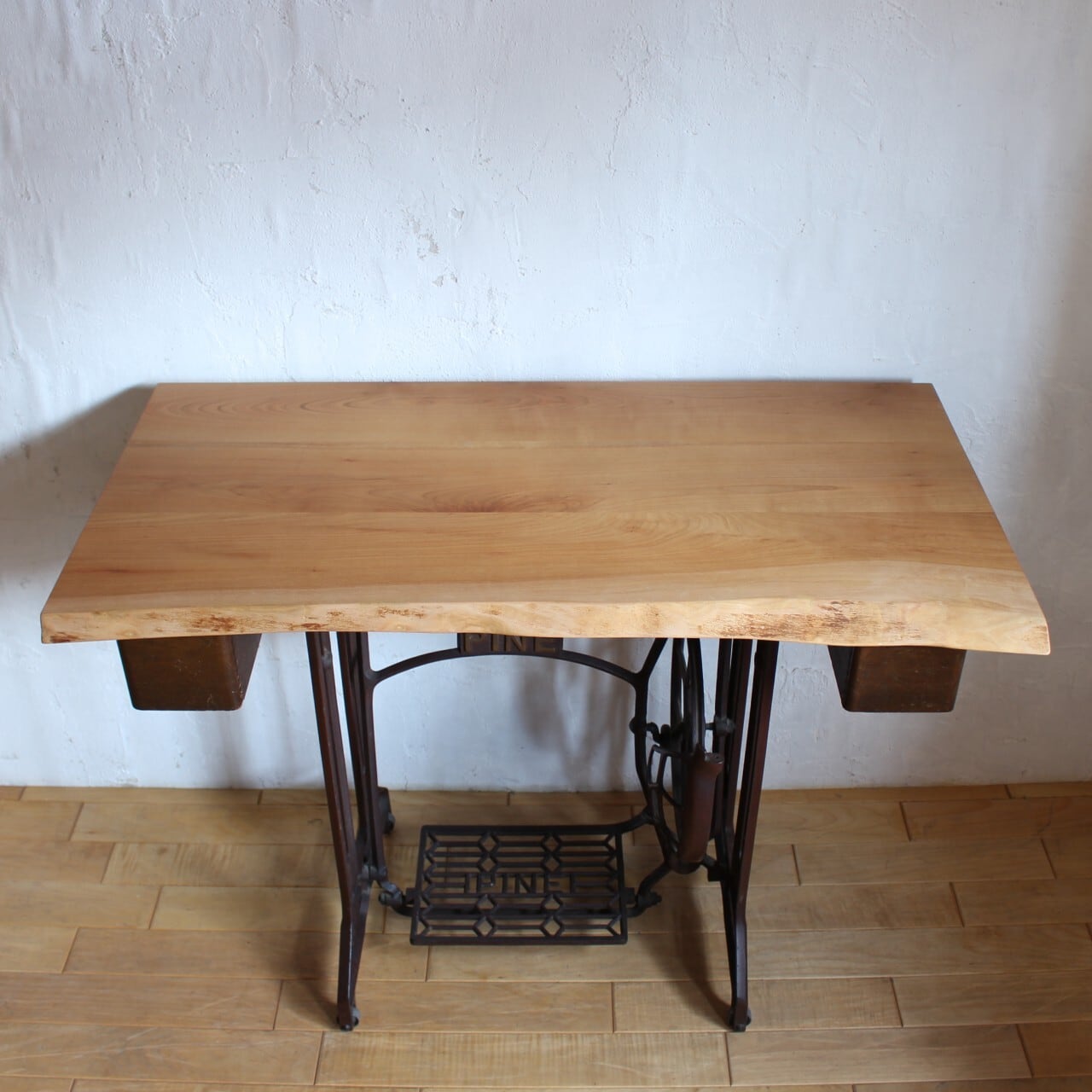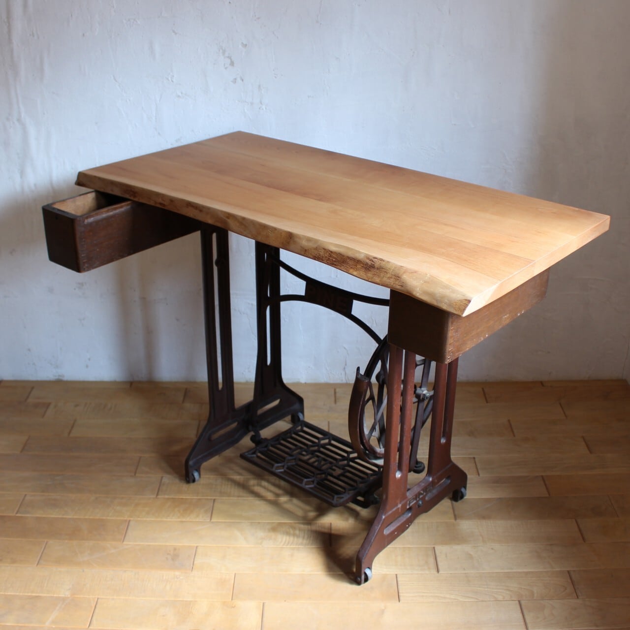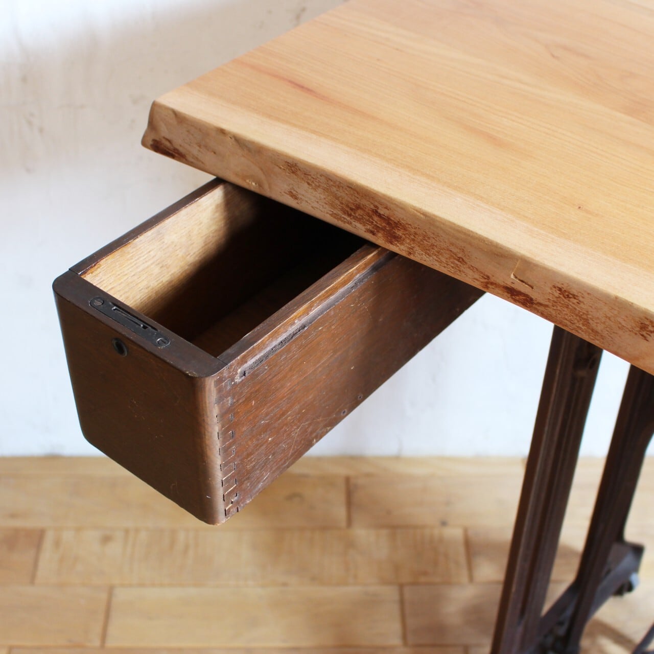昭和時代に使用されていた脚踏みミシンの脚を使った引出付きのデスクです。