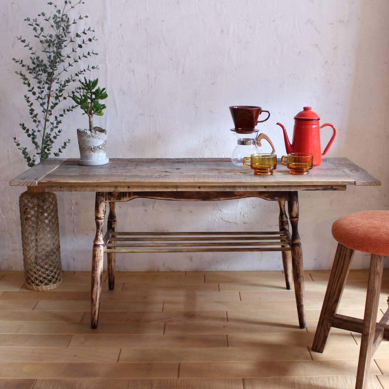 天板は古材で作り替え、脚部はそのまま使用し塗装直しをしました。